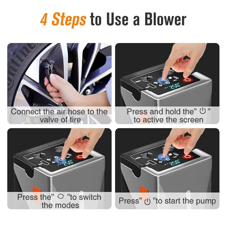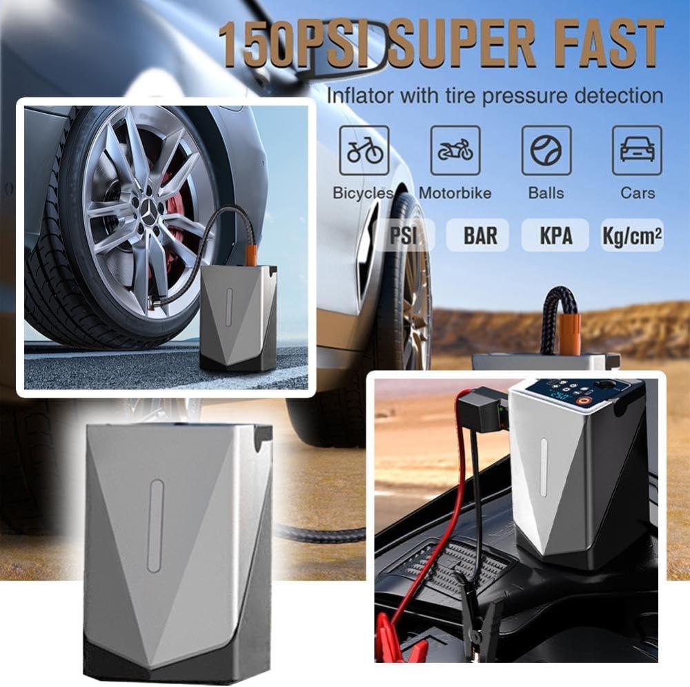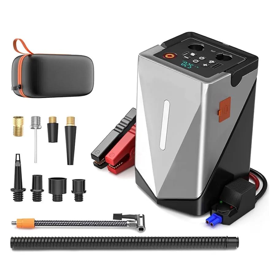 🛠️ منفاخ إطارات مدمج: يضبط كاوتش عربيتك في دقائق مع شاشة رقمية لقياس ضغط الهواء.